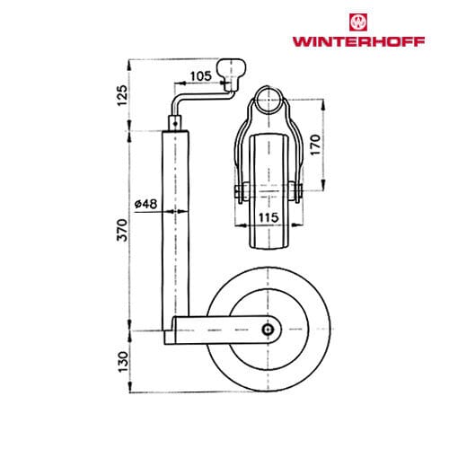 Winterhoff, Saksalainen laatu nokkapyörä mm. perävaunuihin ja venetrailereihin. Ilma täytteinen pyörä ja metalli vanne.Kantavuus: 150kgPyörä: ilmakumipyörä 260x85mmSäätövara: 210mmVanne: metalliPutki: 48mm