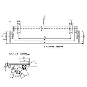 Nieper kumijousiakseli 1500 kg kantavuudella. Huoltovapaa kompaktilaakerointi. Knott 200×50 (20-2425/1) jarru. Sis. 830mm (kuoren mitta) jarruvaijerin. poikkeavat mitat ilmoitettava tilattaessa.Yhteensopivuus Knott KF ja KRV-mallien kanssa. (Myös muut yhdistelmät eri merkkien välillä mahdollisia, tarkistettava tapauskohtaisesti)Kaikissa malleissa ei stefaaKiinnitysväli A:1200mm, laippamitta C:1685mm. Pulttijako 5×112.