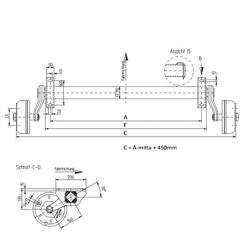 Nieper kumijousiakseli 1500 kg kantavuudella. Huoltovapaa kompaktilaakerointi. Knott 200×50 (20-2425/1) jarru. Sis. 930mm (kuoren mitta) jarruvaijerin. poikkeavat mitat ilmoitettava tilattaessa.Yhteensopivuus Knott KF ja KRV-mallien kanssa. (Myös muut yhdistelmät eri merkkien välillä mahdollisia, tarkistettava tapauskohtaisesti)Kaikissa malleissa ei stefaaKiinnitysväli A:1350mm, laippamitta C:1835mm. Pulttijako 5×112.