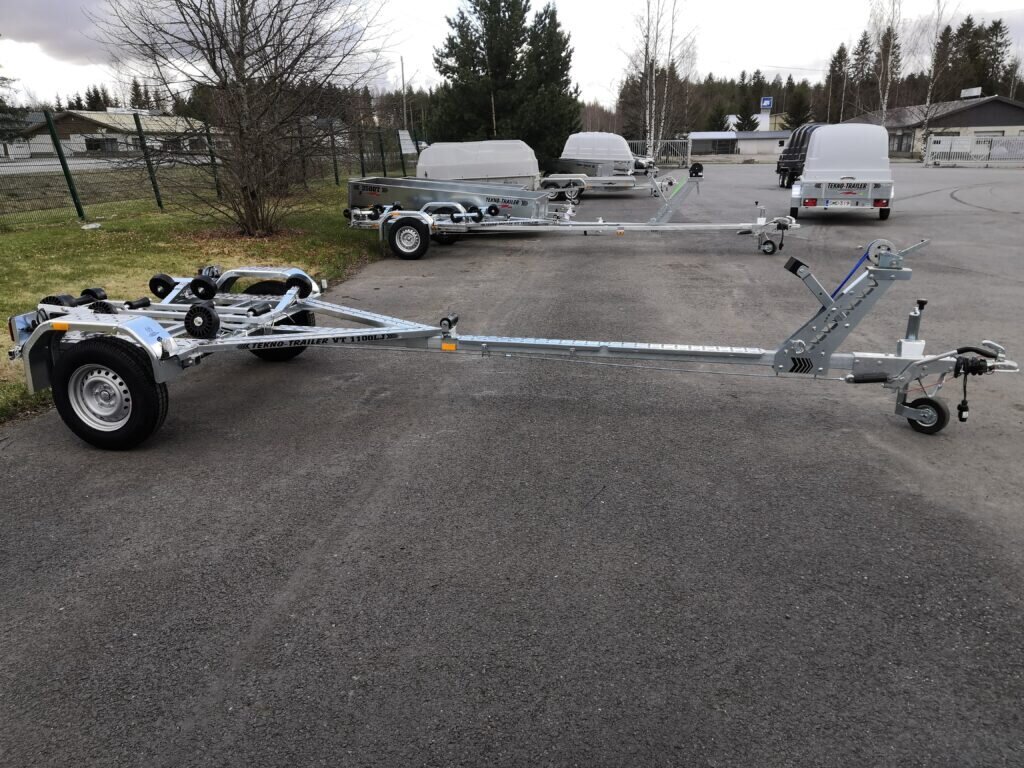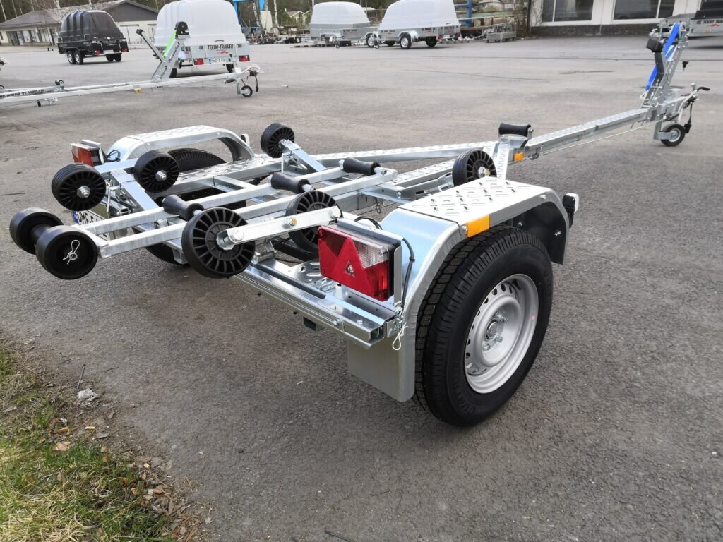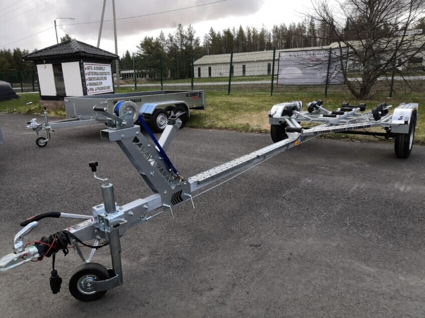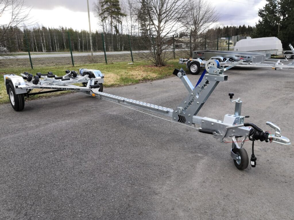 Vinssitelineessä monipuoliset pituus- ja korkeussäädöt. Sivutuet umpikumipyörillä, leveys- ja korkeussäädöillä. Kaikki trailerin säädöt voidaan tehdä vaivattomasti ilman avaimia.