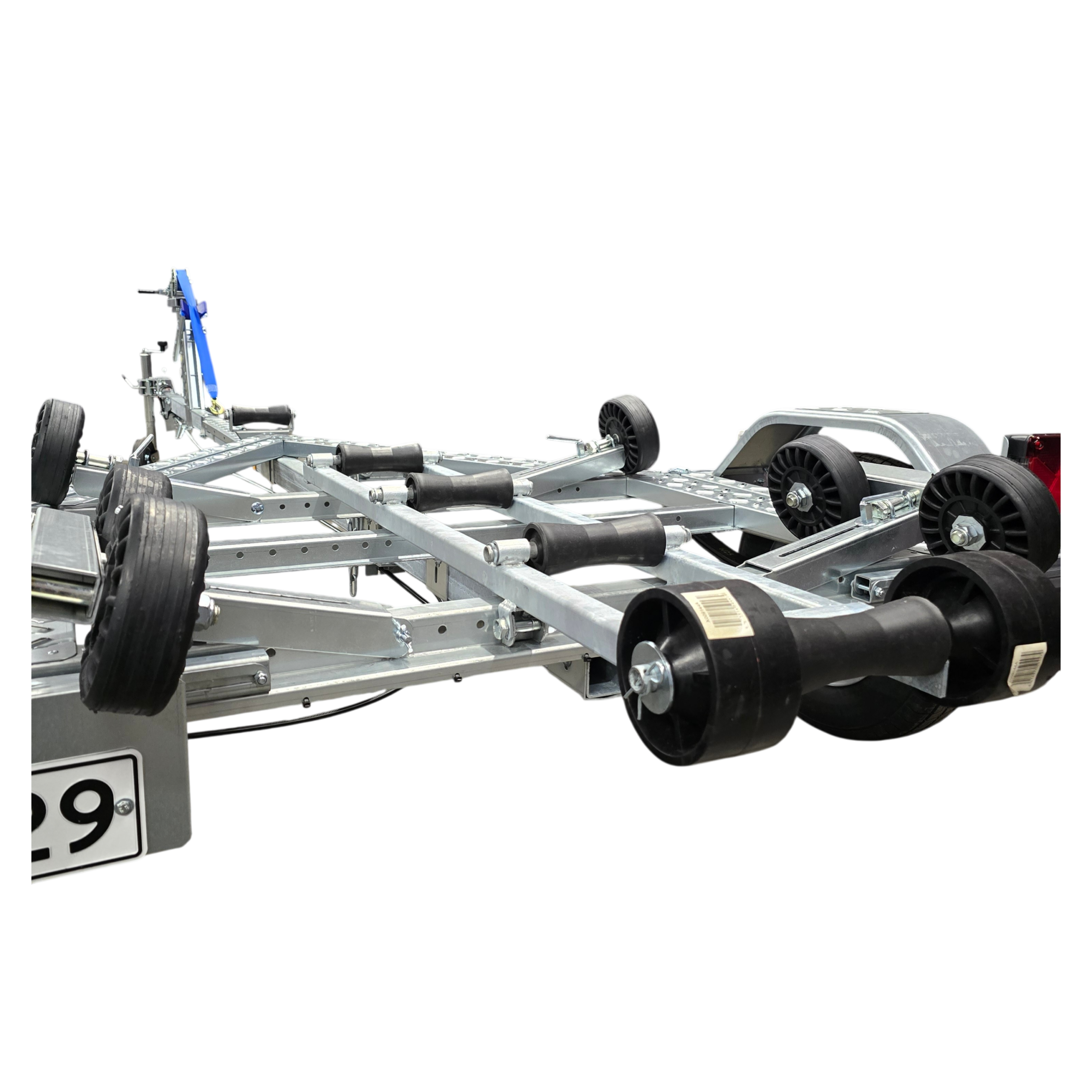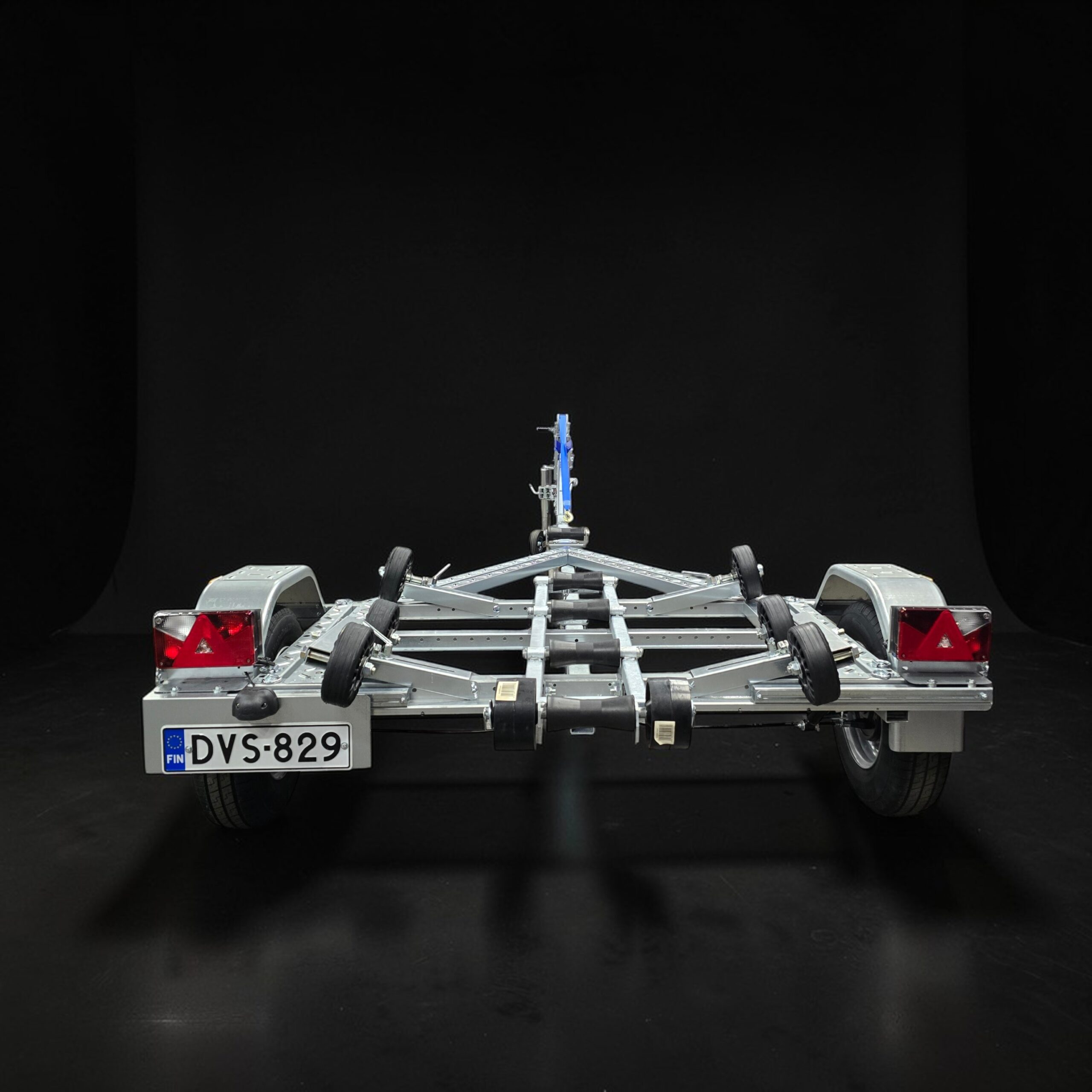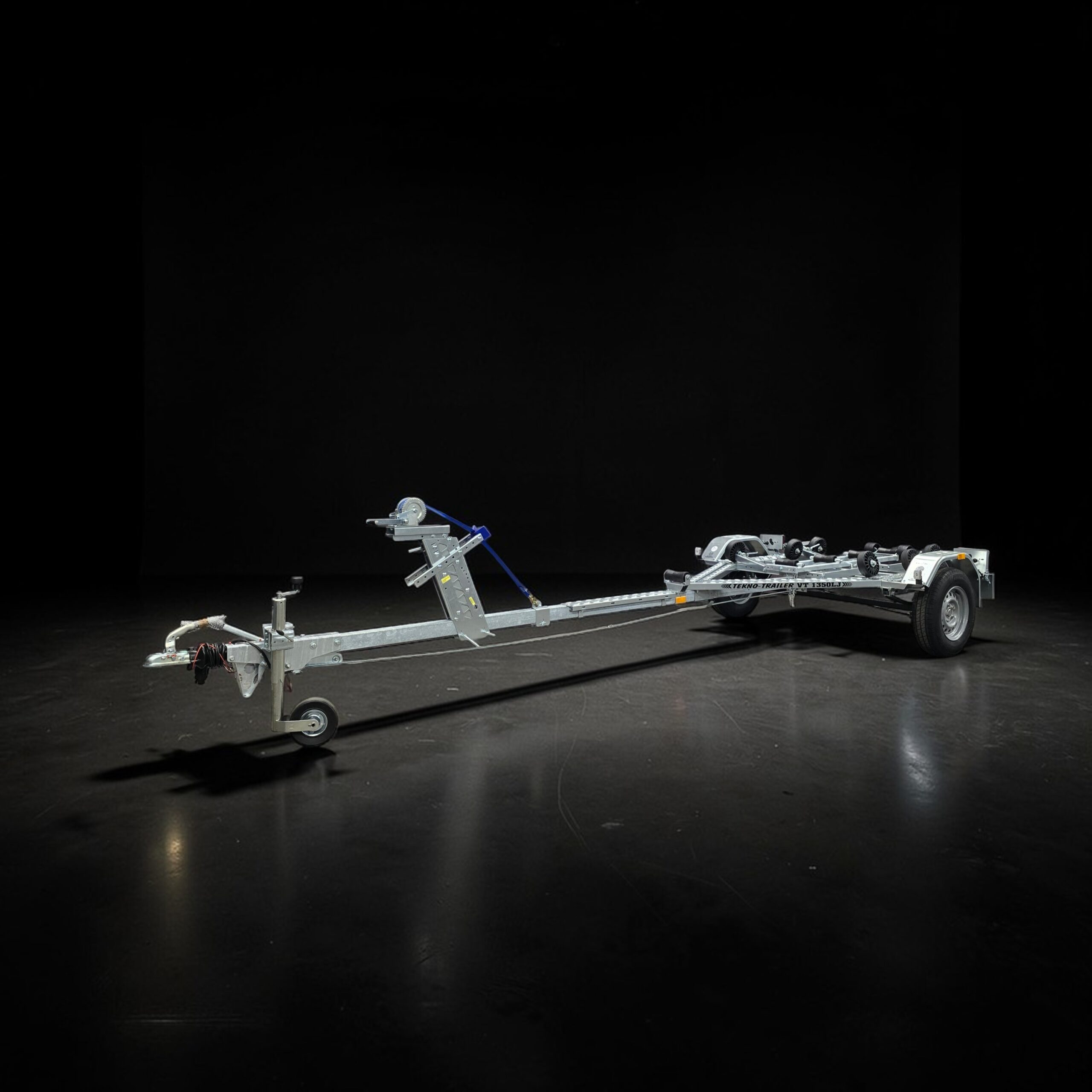 Vinssitelineessä monipuoliset pituus- ja korkeussäädöt. Sivutuet umpikumipyörillä, leveys- ja korkeussäädöillä. Kaikki trailerin säädöt voidaan tehdä vaivattomasti ilman avaimia.