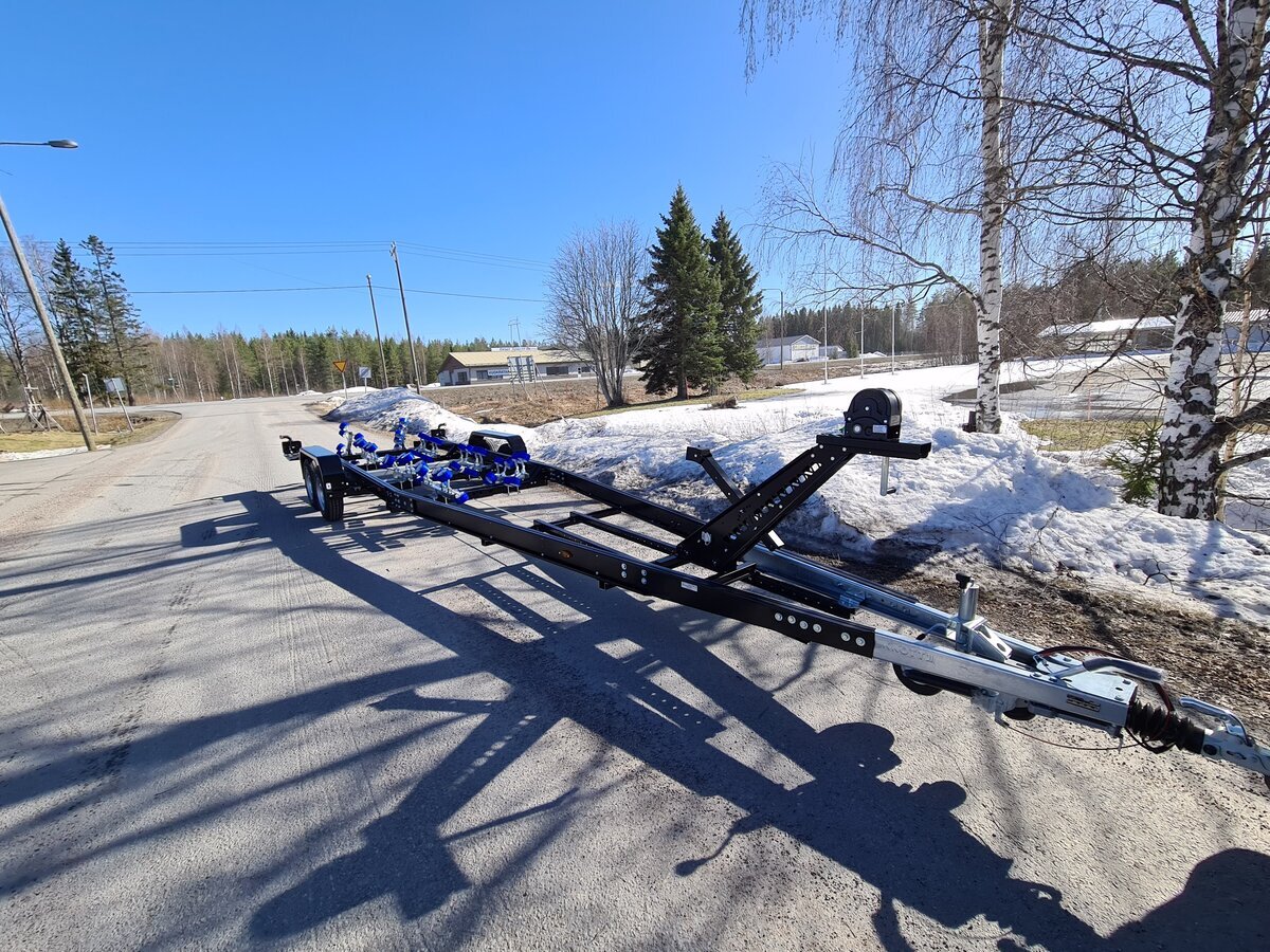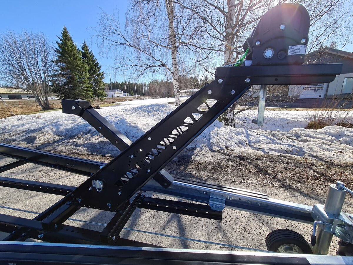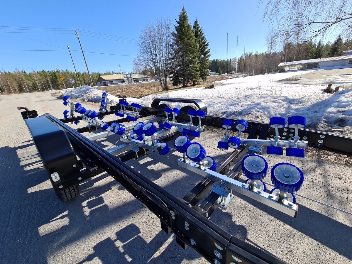 Vinssitelineessä monipuoliset pituus- ja korkeussäädöt. Sivutuet umpikumipyörillä, leveys- ja korkeussäädöillä. Kaikki trailerin säädöt voidaan tehdä vaivattomasti ilman avaimia.