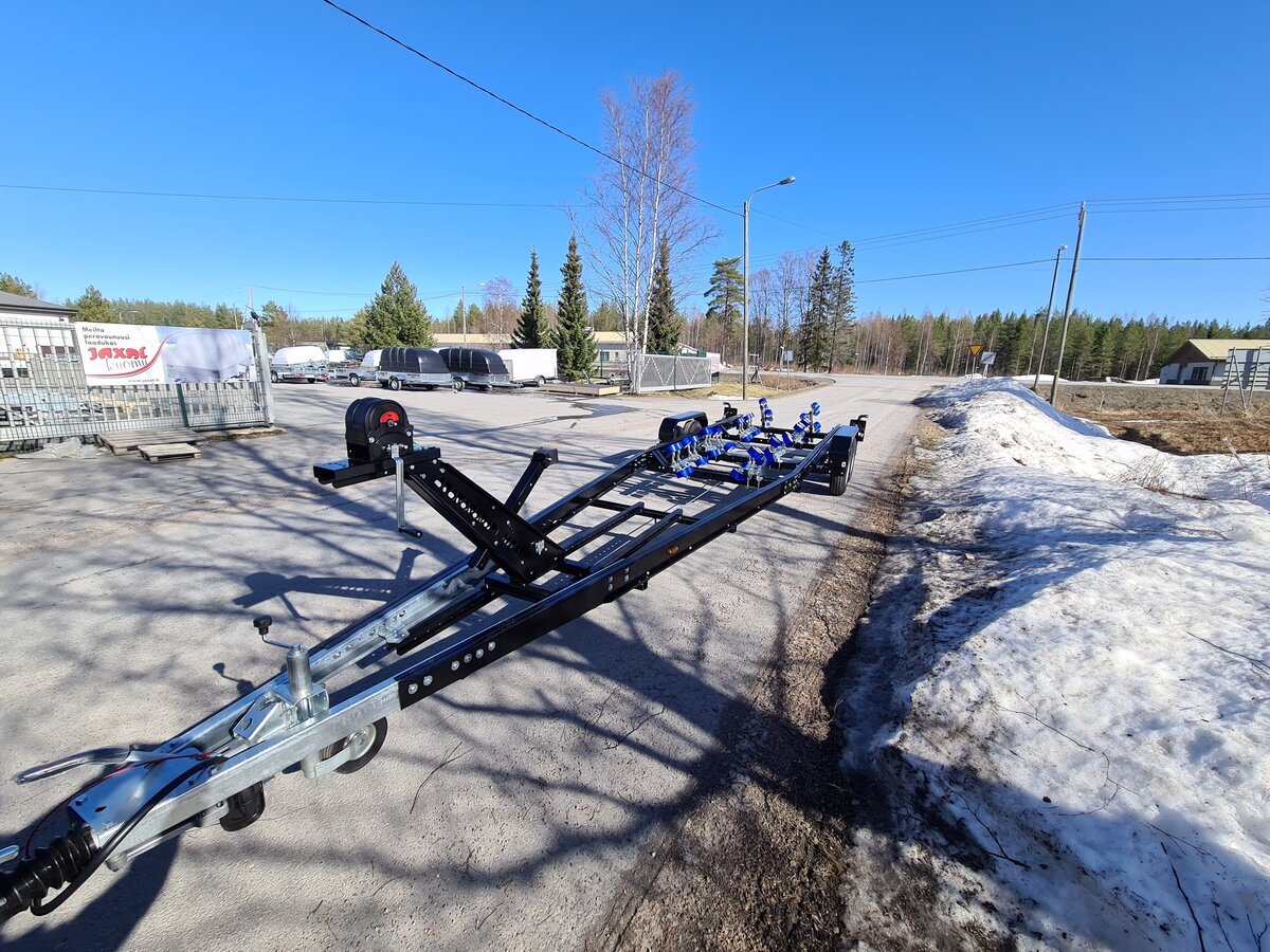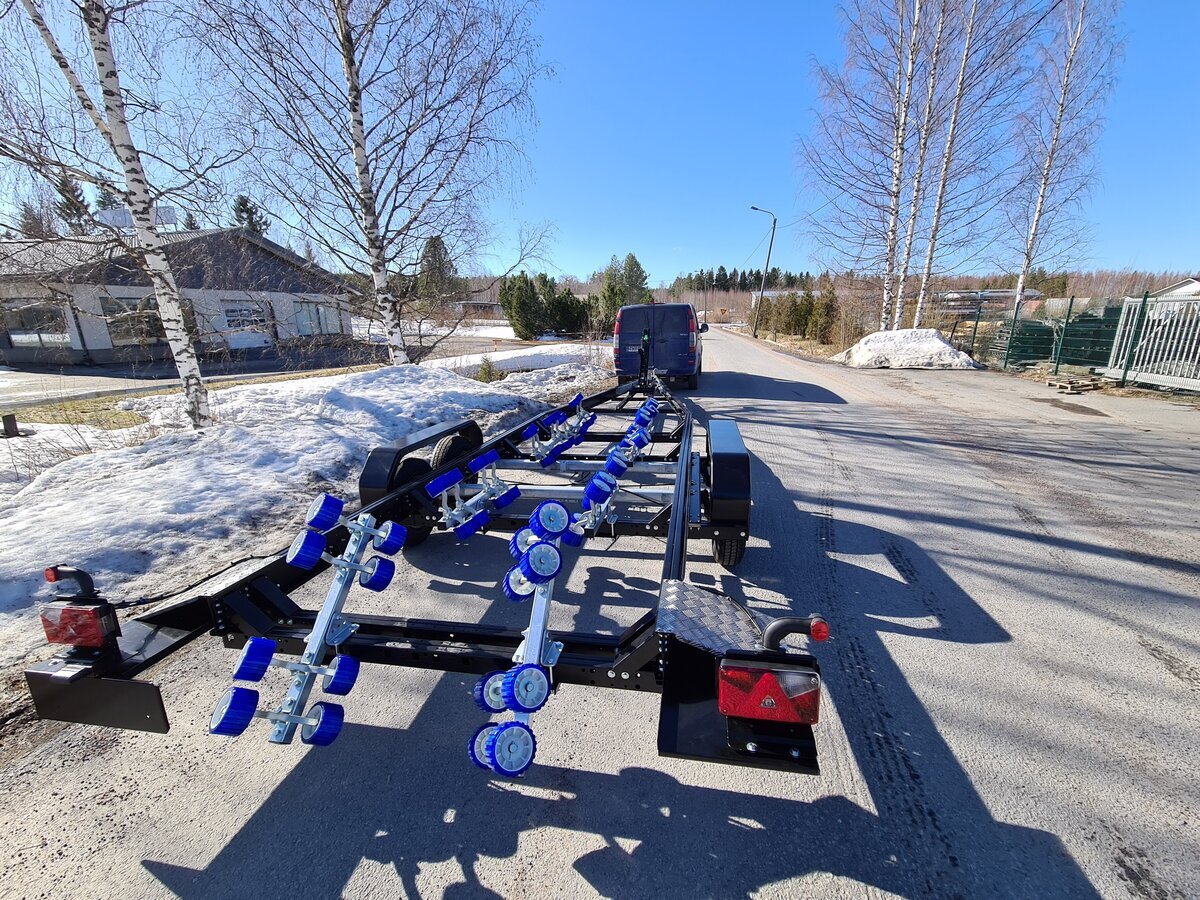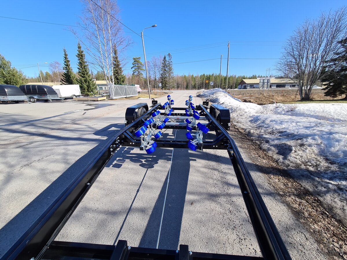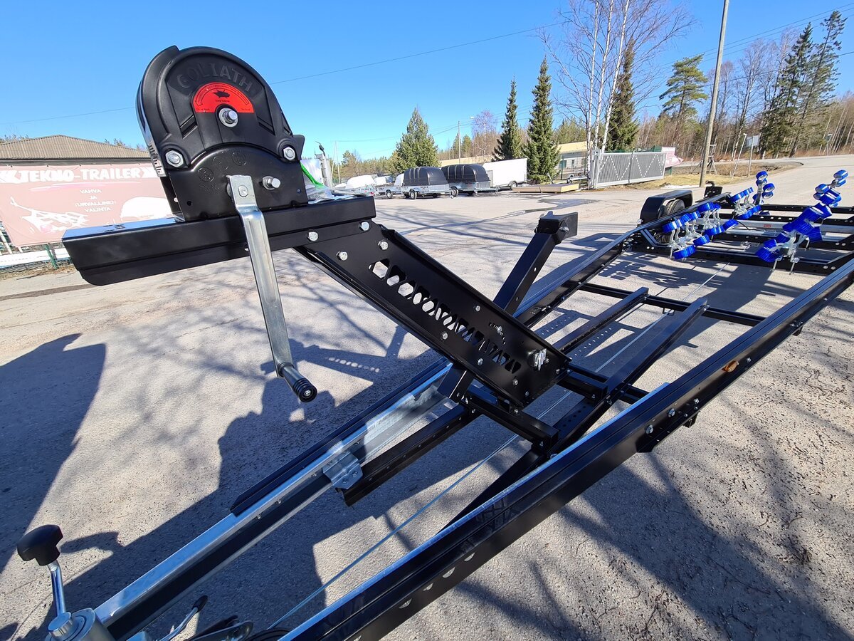 Vinssitelineessä monipuoliset pituus- ja korkeussäädöt. Sivutuet umpikumipyörillä, leveys- ja korkeussäädöillä. Kaikki trailerin säädöt voidaan tehdä vaivattomasti ilman avaimia.