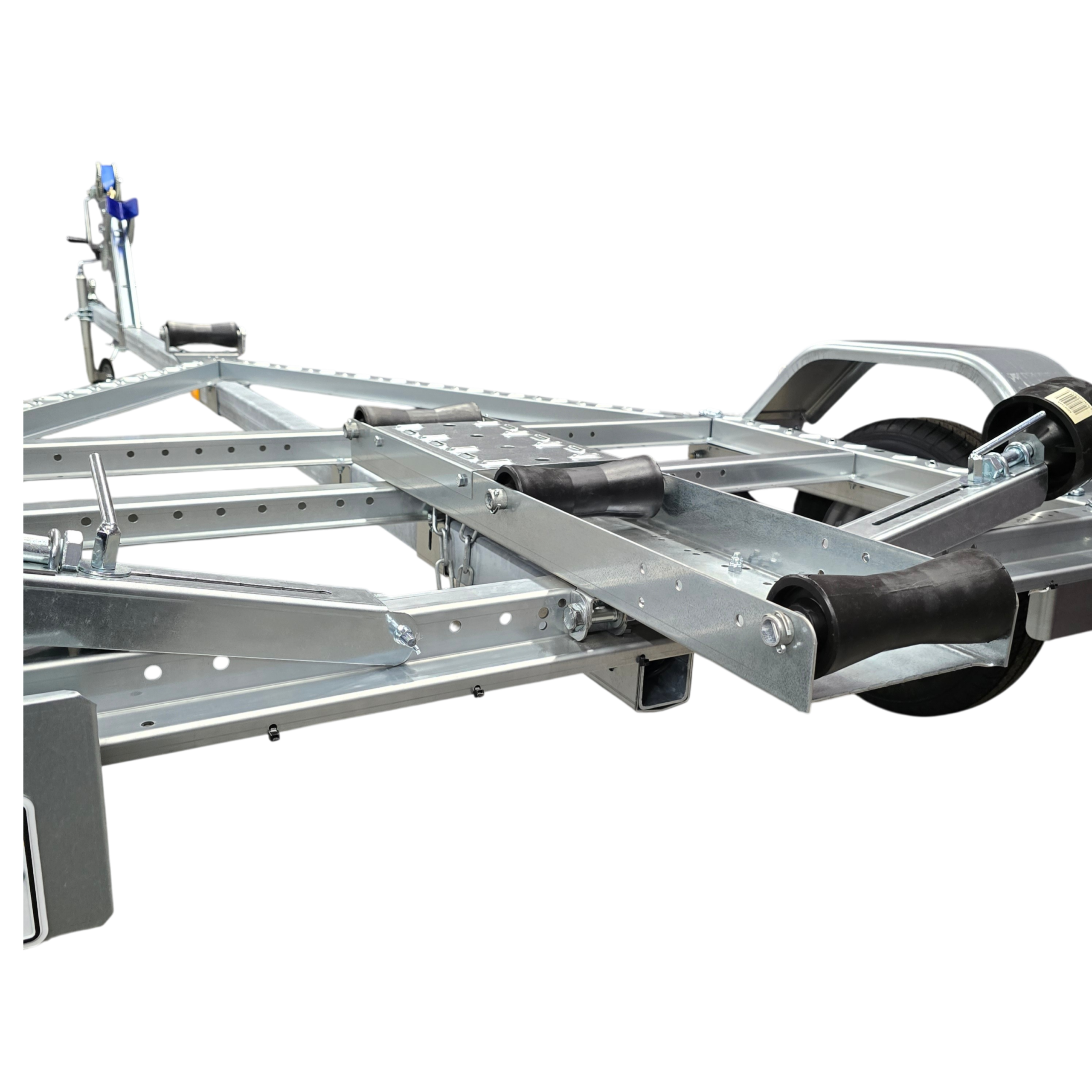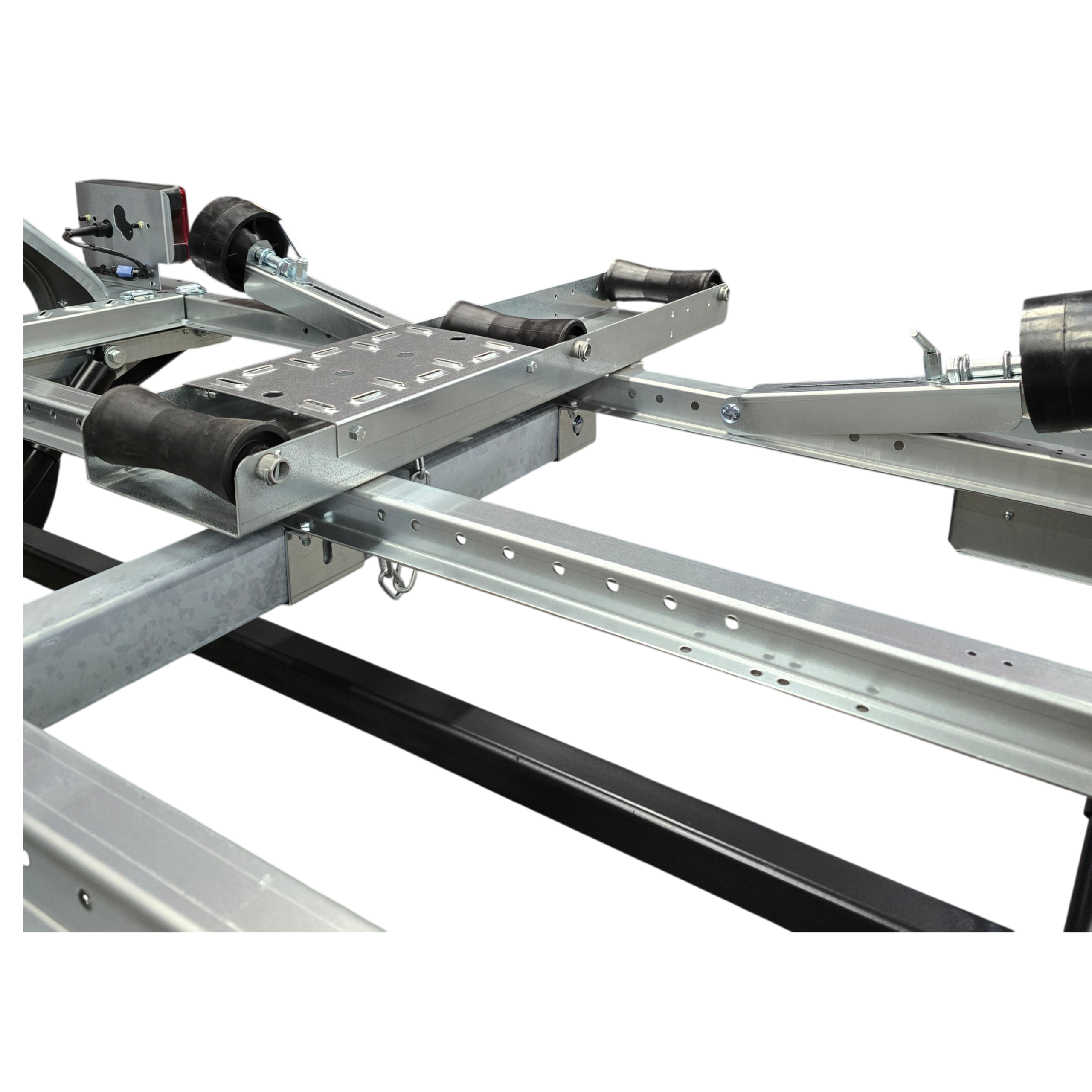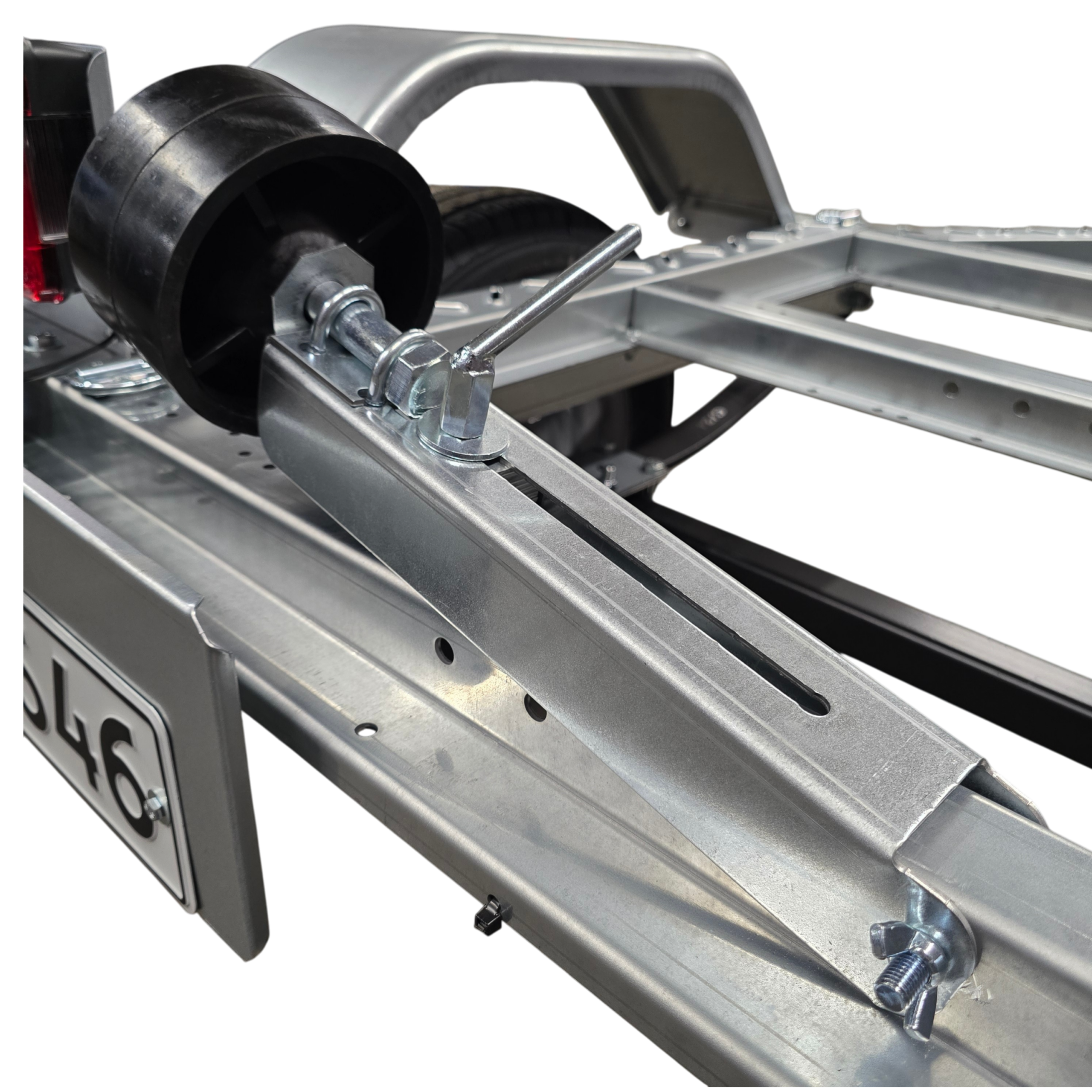 Vinssitelineessä monipuoliset pituus- ja korkeussäädöt. Sivutuet umpikumipyörillä, leveys- ja korkeussäädöillä. Kaikki trailerin säädöt voidaan tehdä vaivattomasti ilman avaimia.